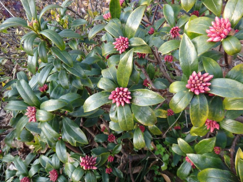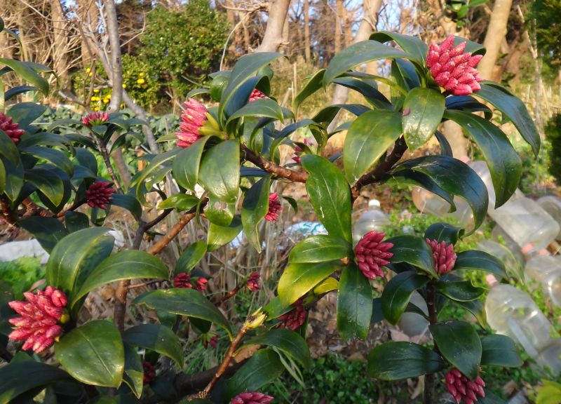 冬の間から旧年の枝先に赤い蕾をつけ、春に花を頭状に開く。