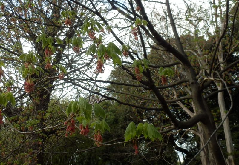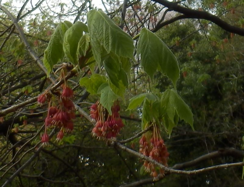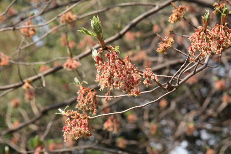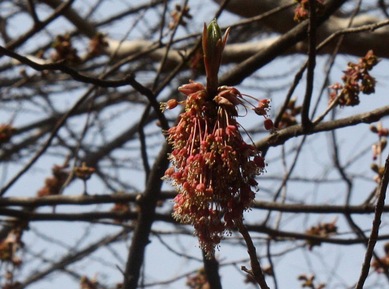 雌雄異株で、葉が展開する前に側芽から散房花序をだし、暗紅色の花をつける。