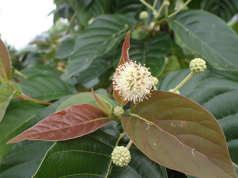 小さい淡黄白色の花を多数咲かせるので、花序は針山状となる。