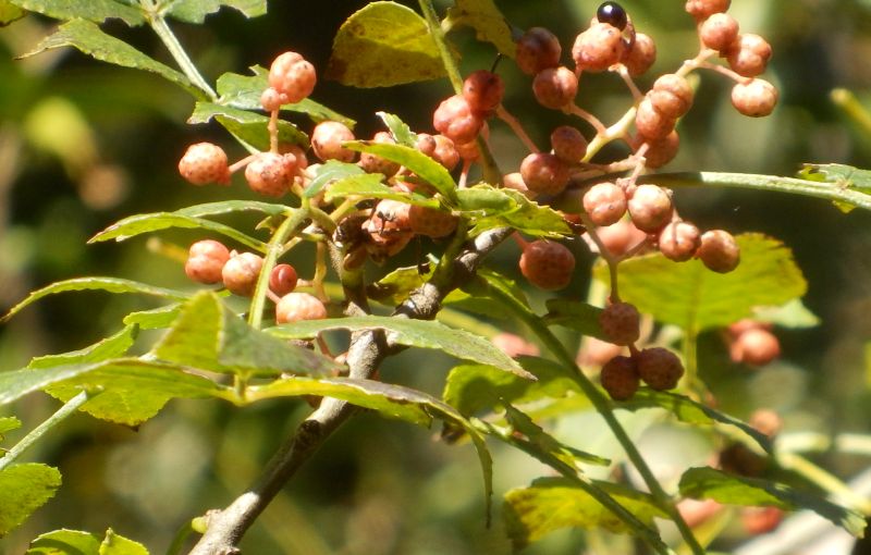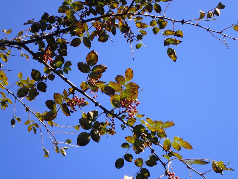 サンショウ :落葉低木、小葉卵形、葉軸に狭翼、棘対生、2分果、香り強。