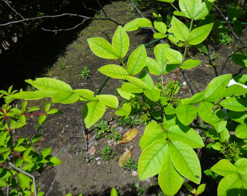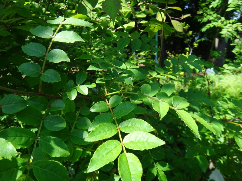 奇数羽状複葉の小葉は卵形で先半分に鈍鋸歯がある。(2016/5/5)