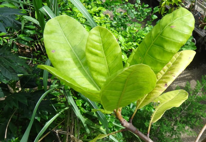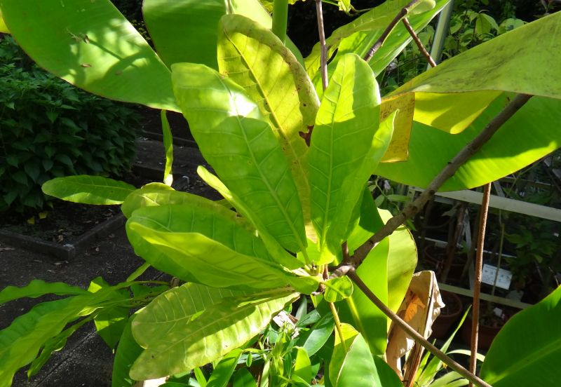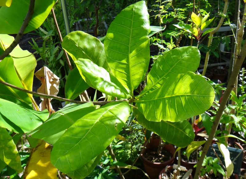 葉は長さ約20センチの倒卵形で、全縁で光沢があり、