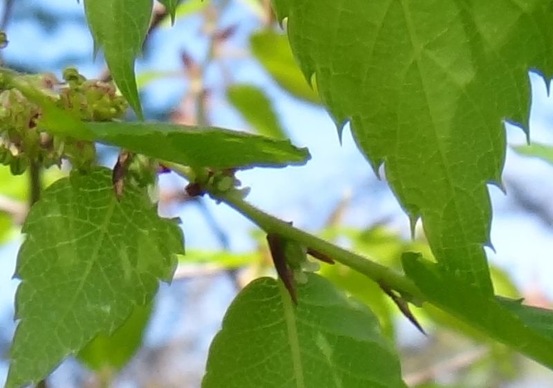 新枝には細毛がある。中央の葉腋に雌花がある。褐色の角状のはまもなく落ちる托葉。(2016/4/11)
