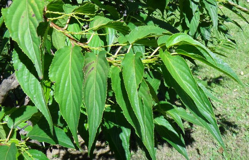 葉は長さ6〜12センチの長楕円形で、先が尖り、鋸歯があり、互生する。