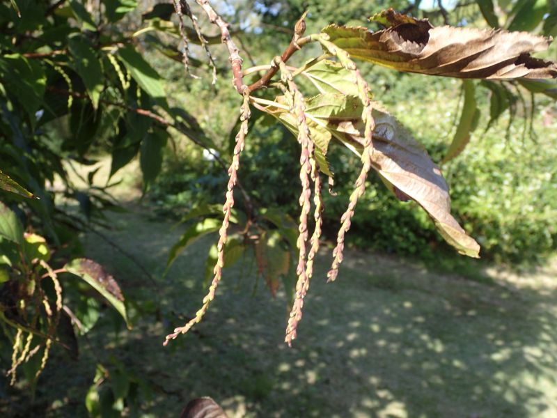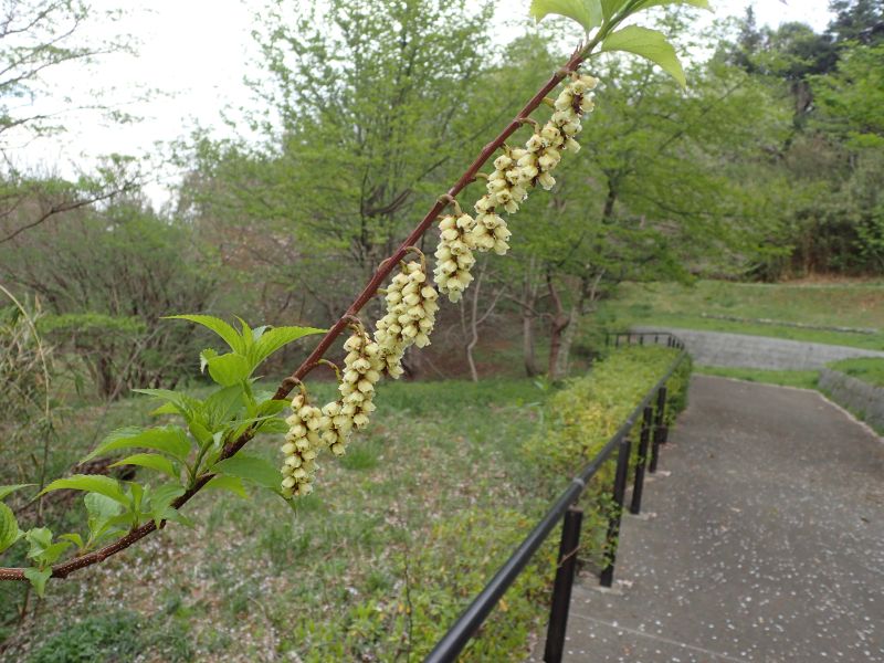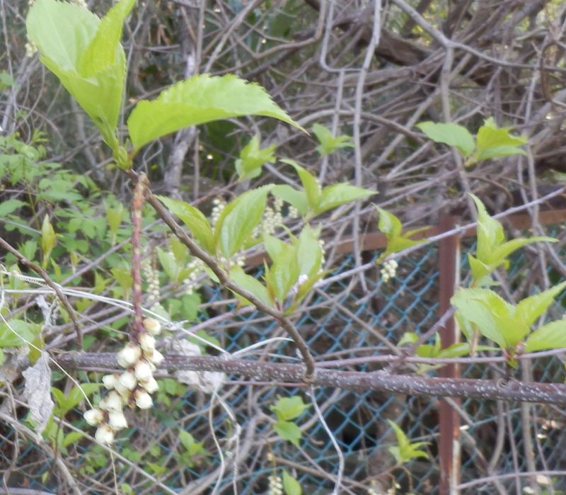 花穂は前年の葉腋につくので、1つの枝に花穂が多数垂れ下がる。(2017/4/15)