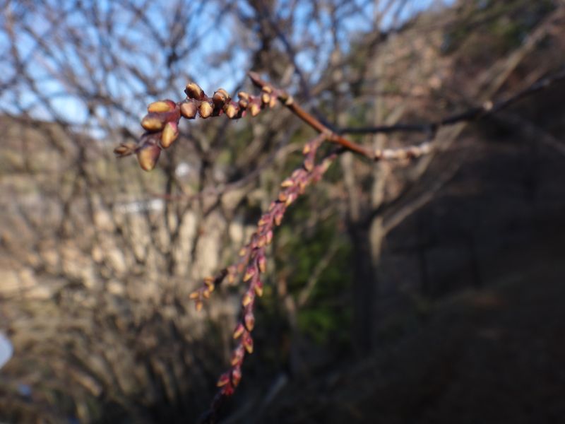 上を向いていた冬芽が春が近づくと次第に下を向くようになる。(2014/1/18)