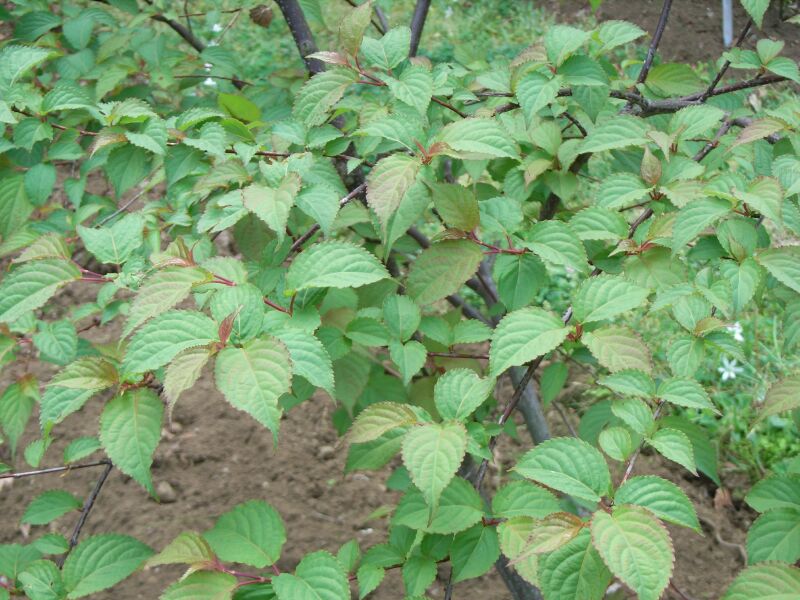 葉は長楕円形で先が尖り、鋸歯がある。若枝は赤褐色。