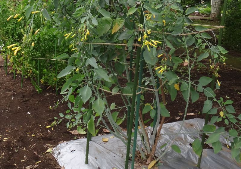 花は黄色くて細長い筒状。斜め下向きに咲くことが多い。(2016/7/28)
