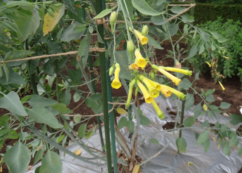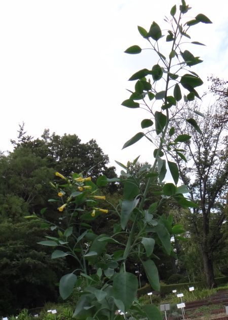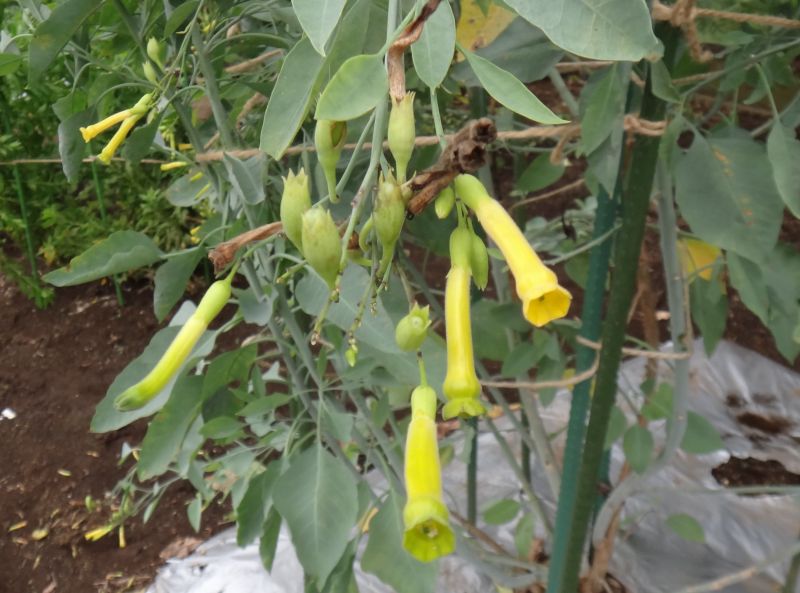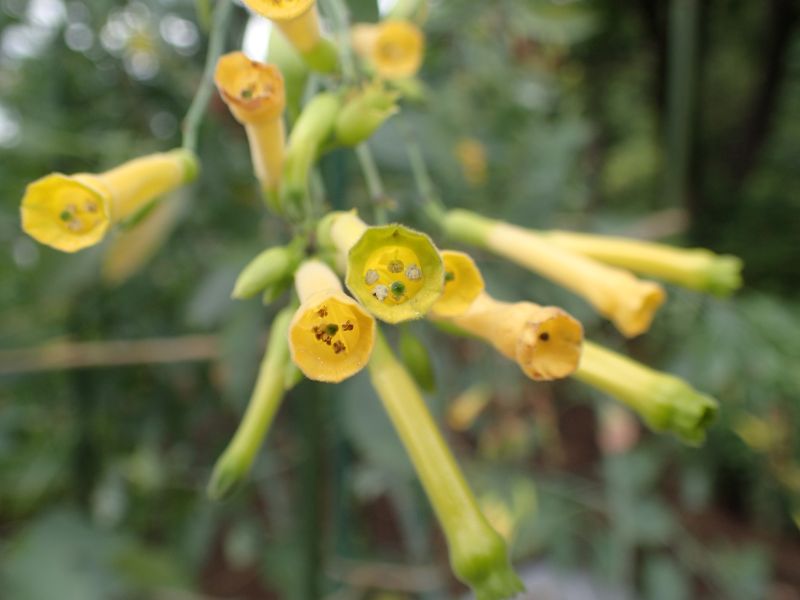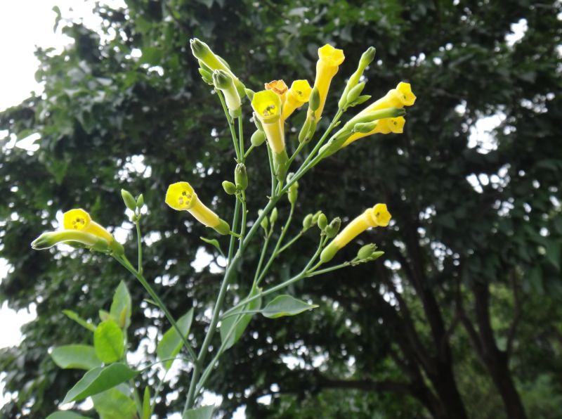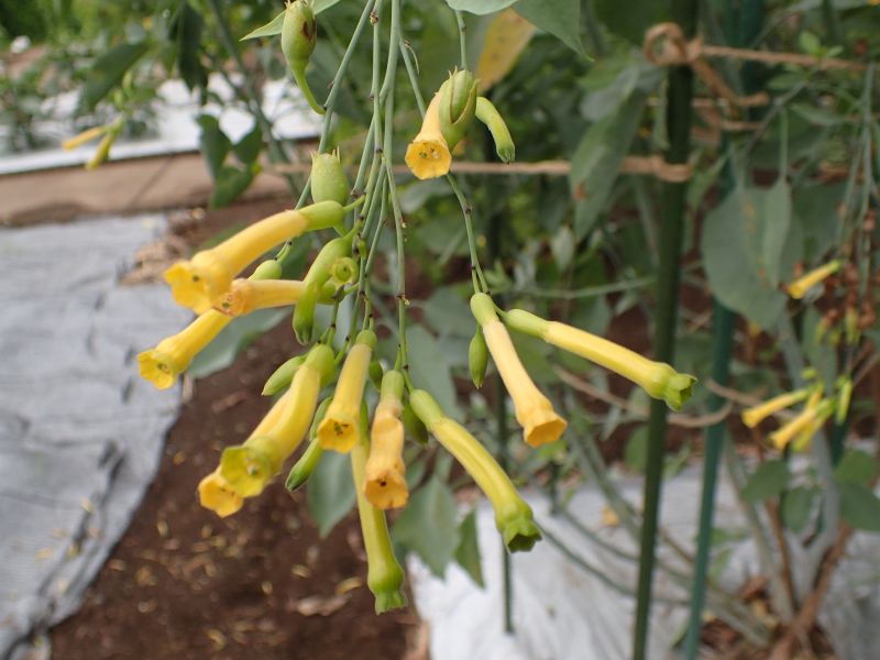 長さ約5センチの黄色い筒状の花を斜め下向きにつける。