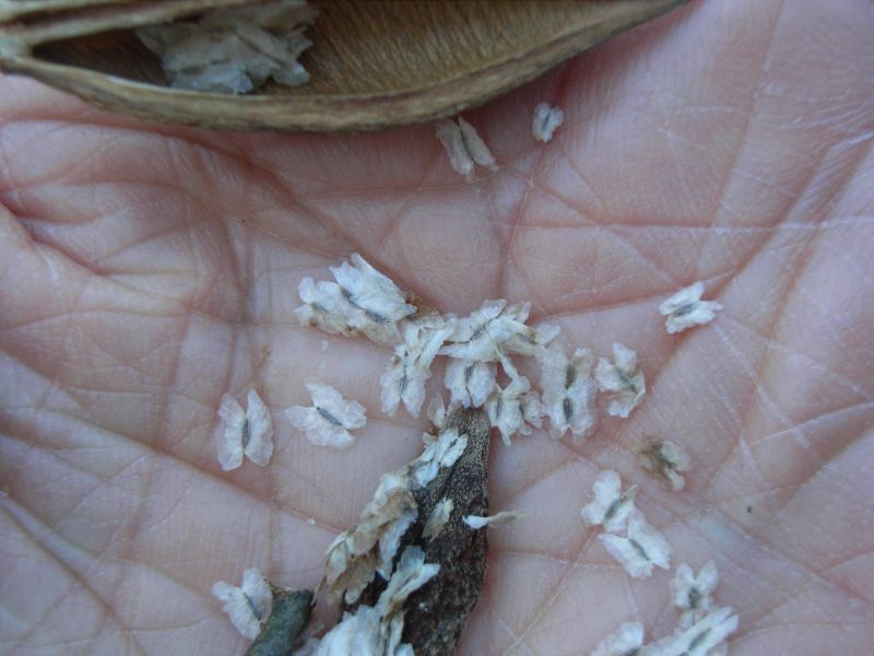 それが縦に2つに割れると翼のついた種子が出て、風で散布される。