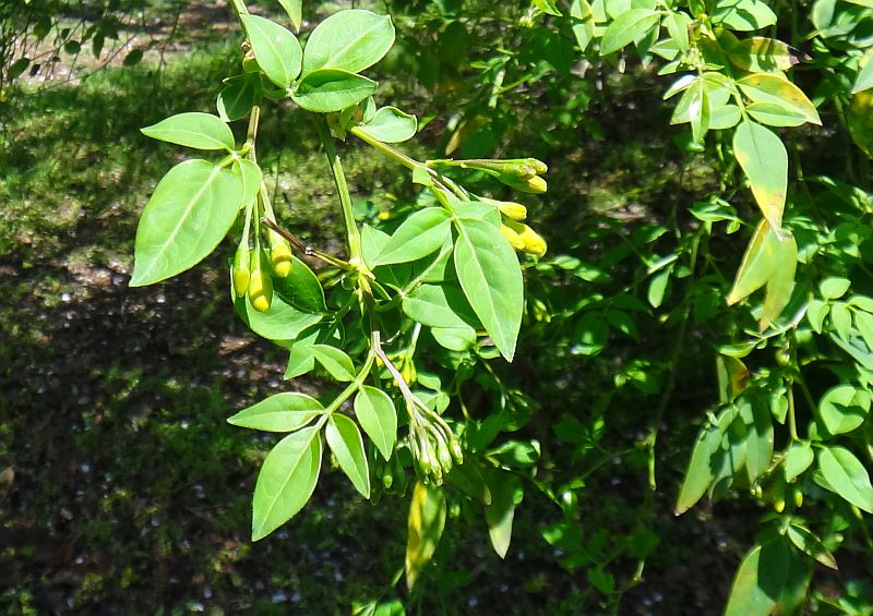 枝先の散房花序に黄色い漏斗状の花が咲き、花筒が長く、