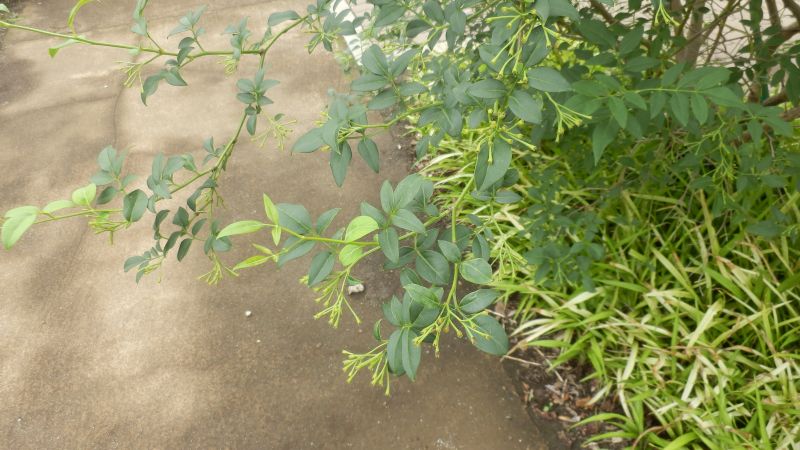 ハゴロモジャスミン:つる性、羽状複葉、花5裂、白、芳香強。