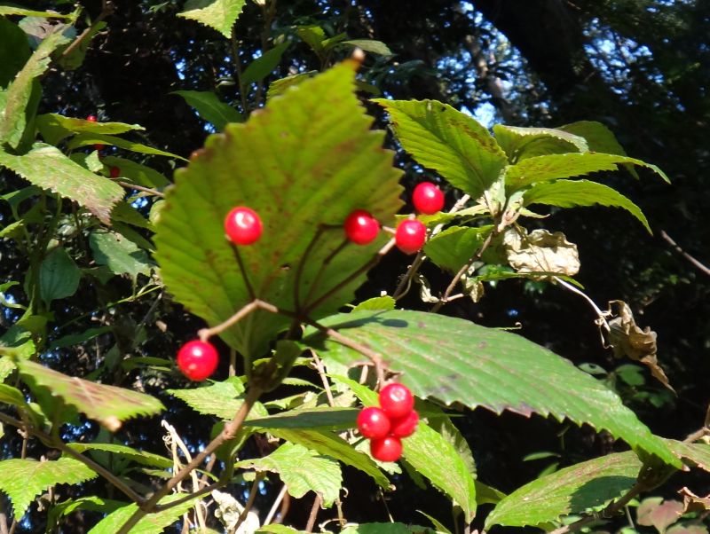 ミヤマガマズミ :落葉、葉柄1〜2センチで絹毛、葉先鋭くとがる、三角鋸歯、若枝紫褐色。