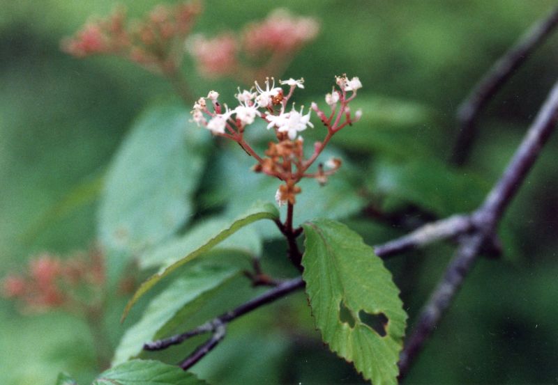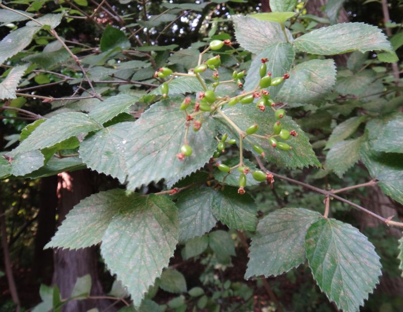 チョウジガマズミ :落葉、葉柄に星状毛、托葉なし、鋸歯、葉先のとがり鈍い、花高坏状、核果黒熟。