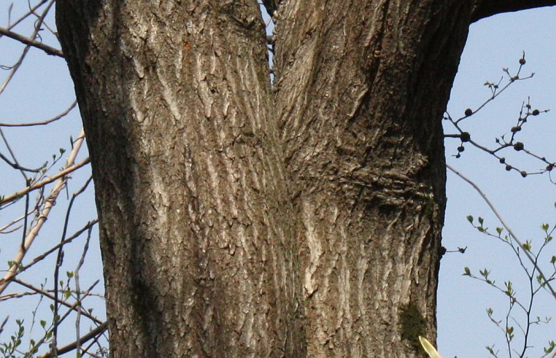 樹皮の裂け目と裂け目の間は平らである。
