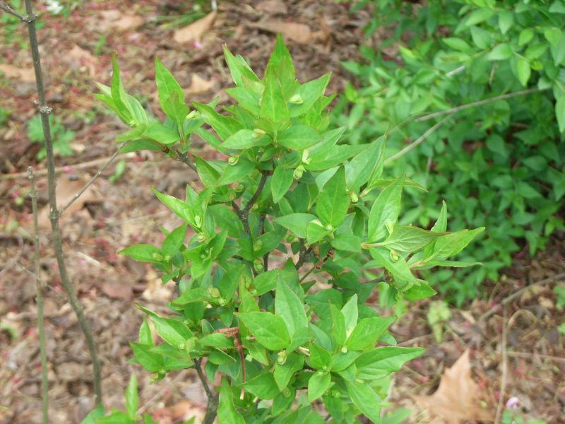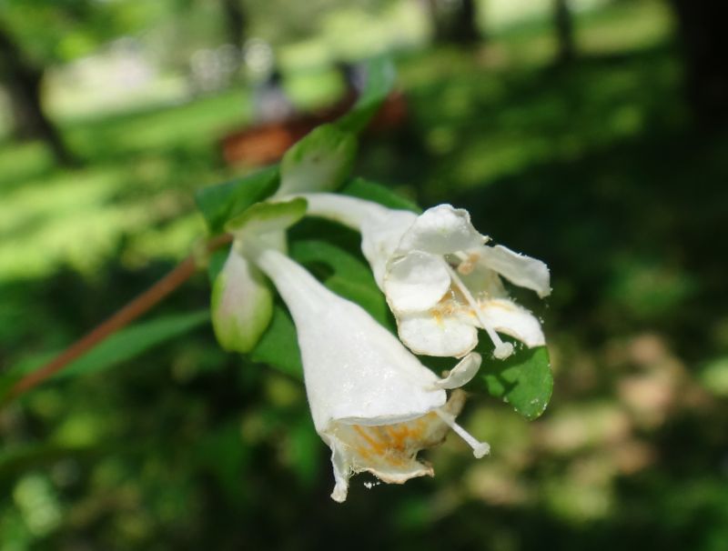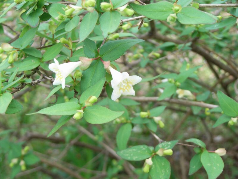 アベリア:花は白で1.5〜2センチのが数個ずつつき、萼は褐色で5枚が多く、花期長く、不稔。
