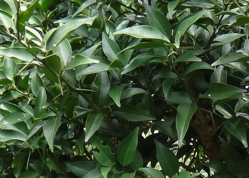 葉は互生し、卵状長楕円形で厚く、先が細長くのび、葉柄に翼がある。