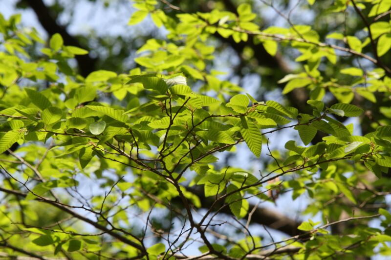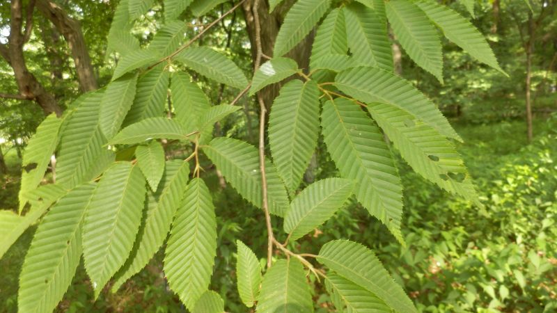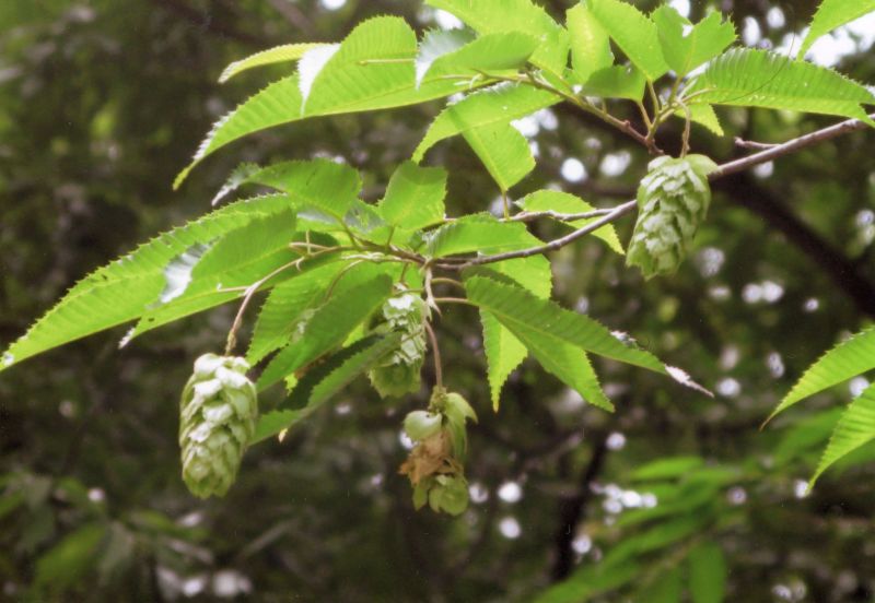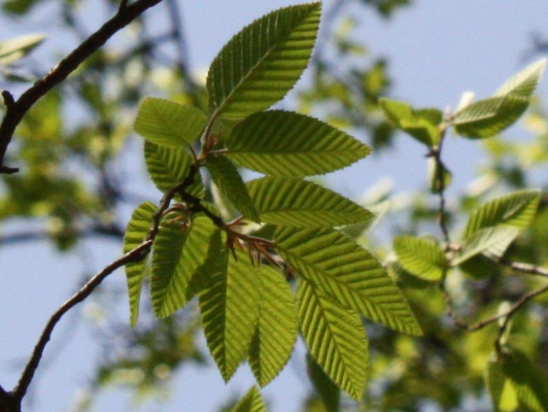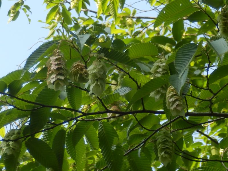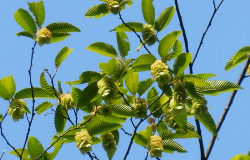 クマシデ:葉が細長く先が尖る、葉柄に軟毛、雄花黄緑色、果穂閉じる。