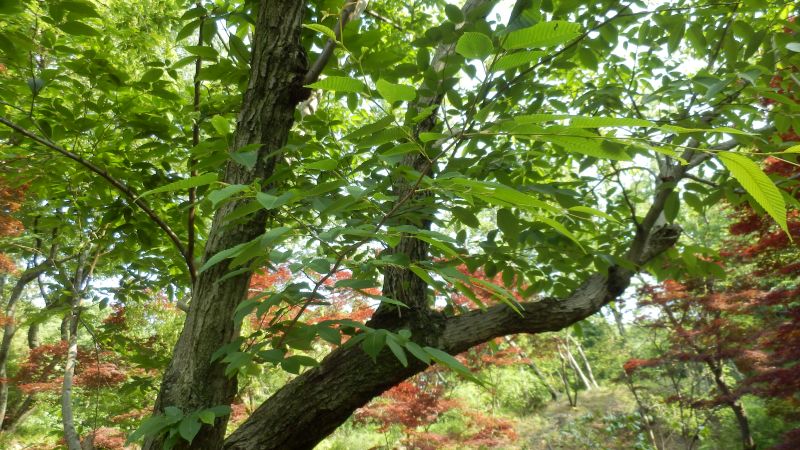 アカシデ:葉先が尾状に尖る、葉柄基部が赤い、雄花帯赤色、果穂開き赤み。紅葉。