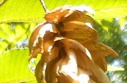 苞がバラバラに落ちる時、堅果も苞にくっついて舞い落ちる。(2017/8/26)