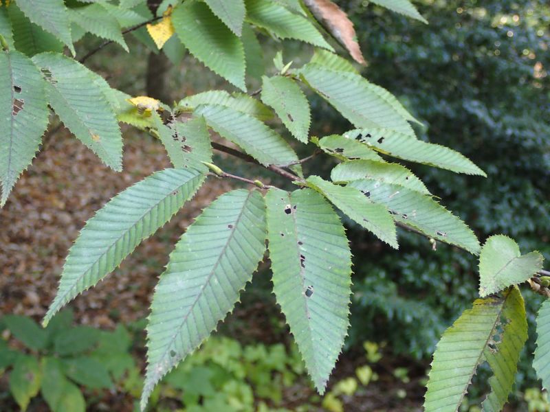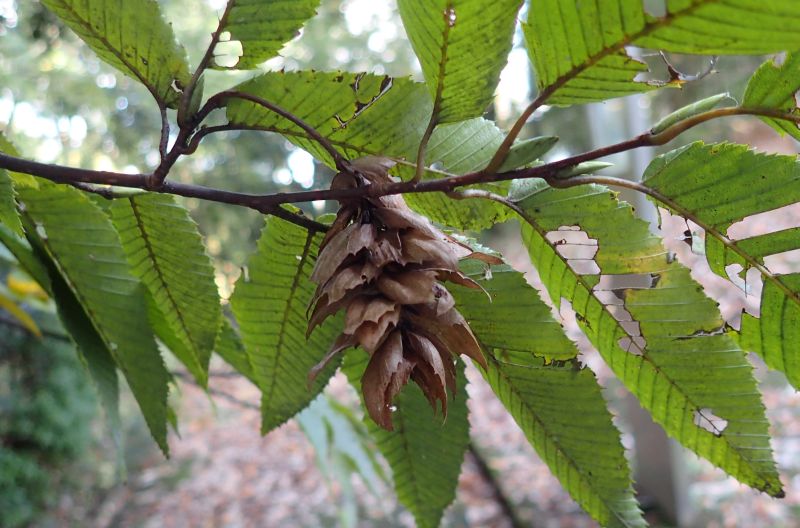 イヌシデ:葉先はあまり尖らない、葉柄に軟毛、雄花黄緑色、果穂開く、黄葉。