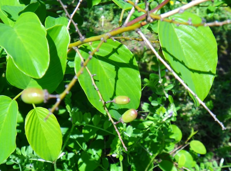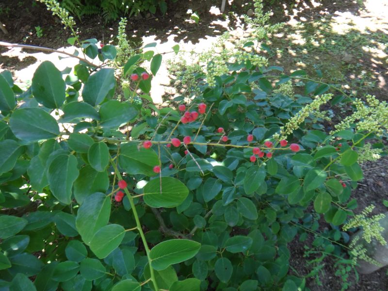 核果は緑→赤→黒と変色する。(2023/6/4)