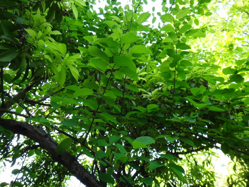 ややつる性で、木は傘状にひろがり、樹皮は紫褐色である。