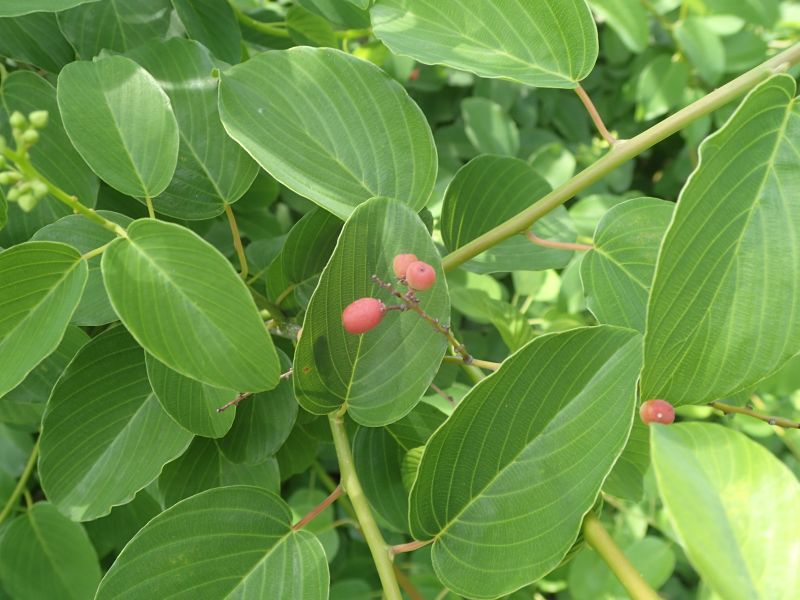 葉は卵形〜長楕円形で先は丸いか鈍くとがり、縁は全縁。