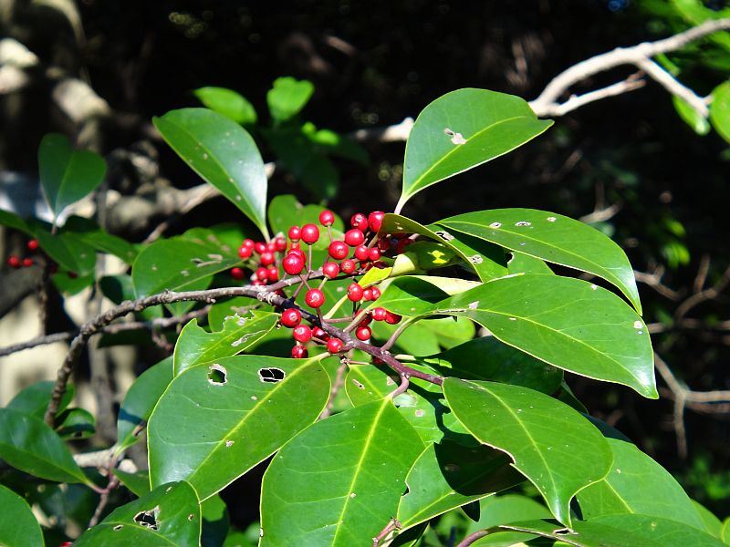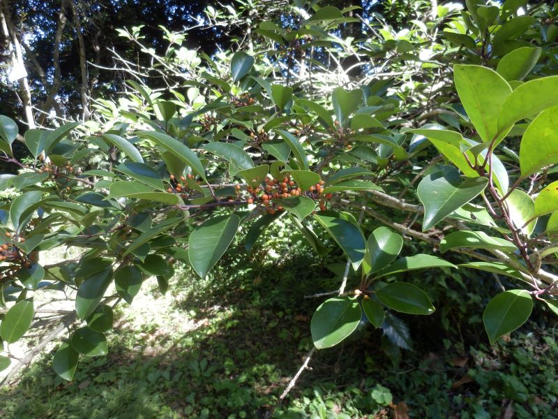 クロガネモチ:葉がやや薄く緑色が濃い、実は直径約6ミリで1つの果柄に数個つき、葉柄が紅色を帯びる。