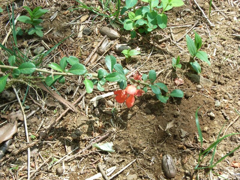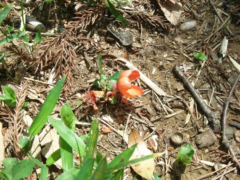 春に葉腋に朱赤色の5弁花を2〜5個づつつける。