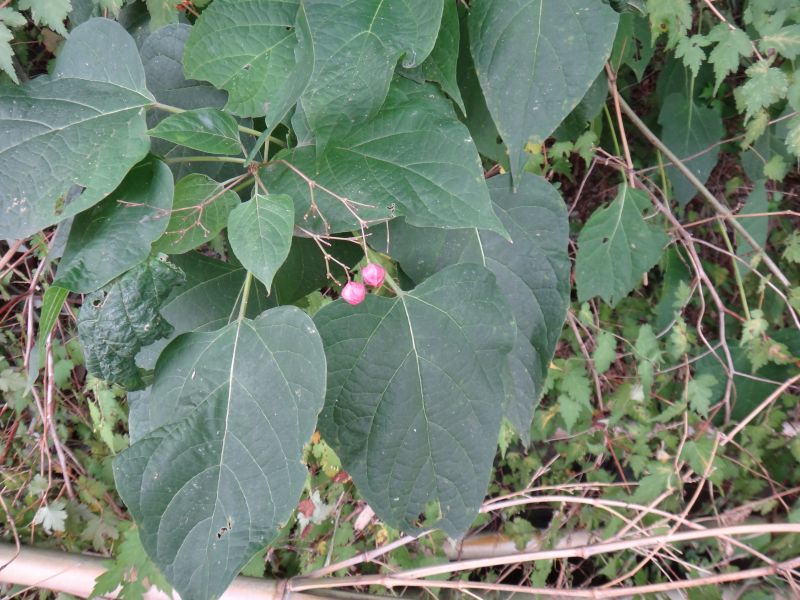 葉は広卵形で柄が長い。赤いのは未熟な果実。