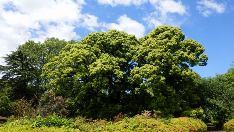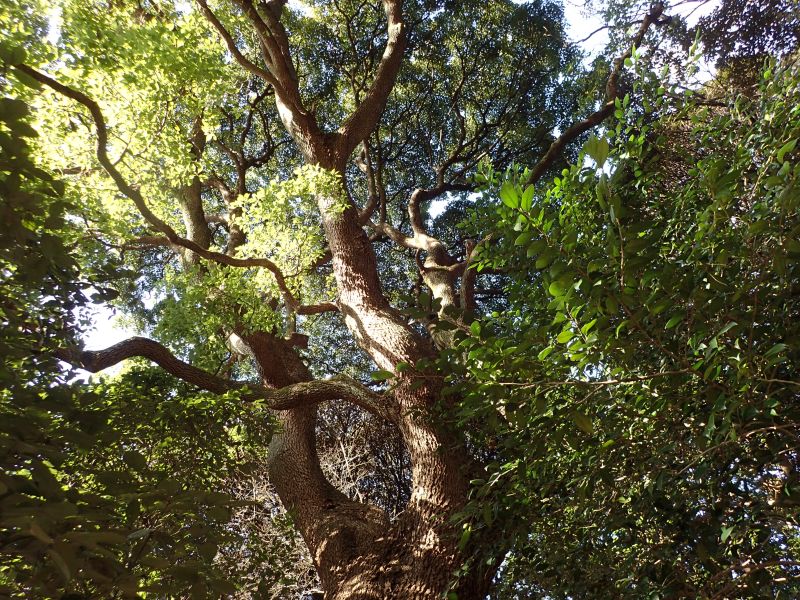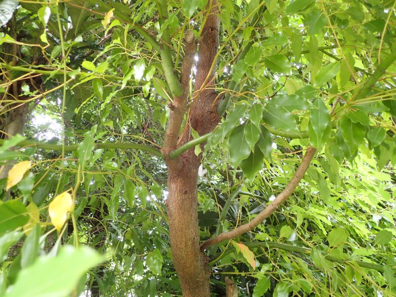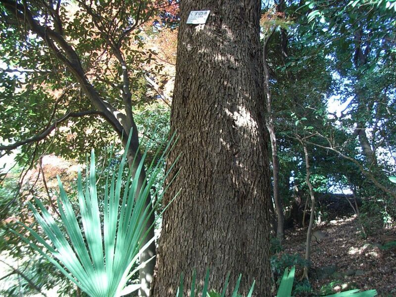 幹は灰白色で短冊状のひび割れがあり、枝分かれごとに曲がることが多い。