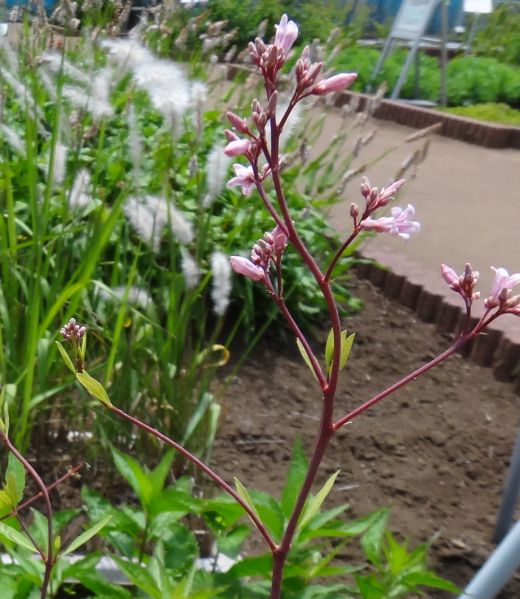 夏から秋にかけて、集散花序に淡紅色か白色の花を咲かせる