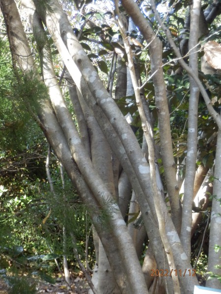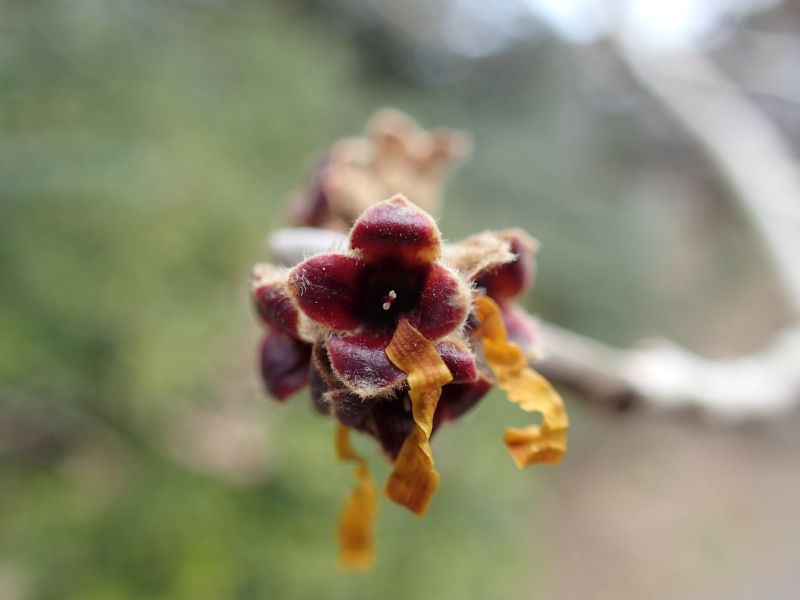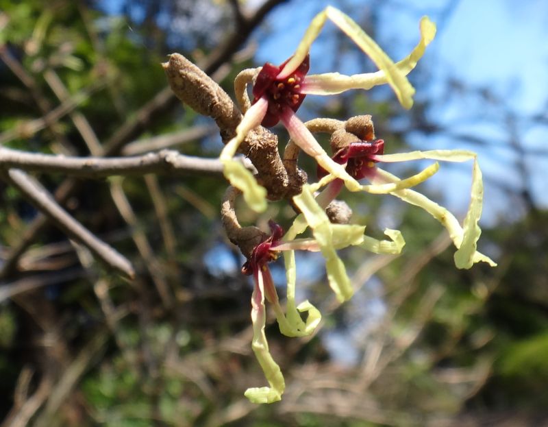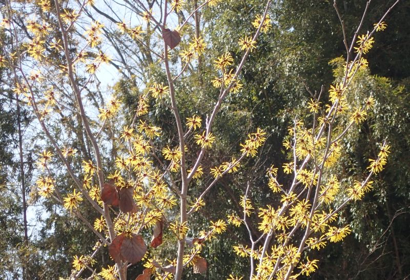 シナマンサク :葉は倒卵形で、葉裏に綿毛が密生、1月から咲く。