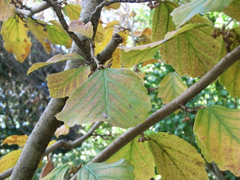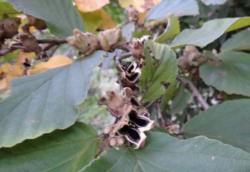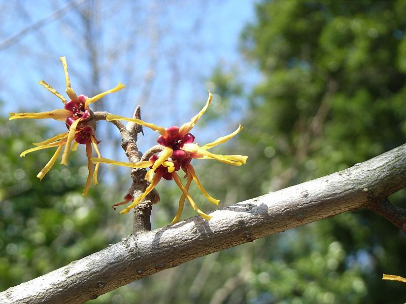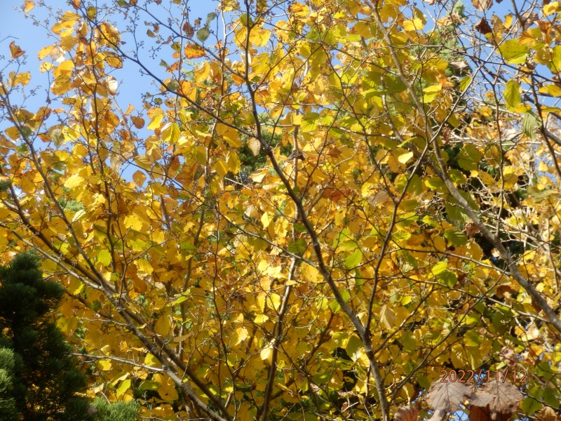 北米原産のアメリカマンサクは、秋の木々が紅葉する頃、黄色い花を咲かせる。