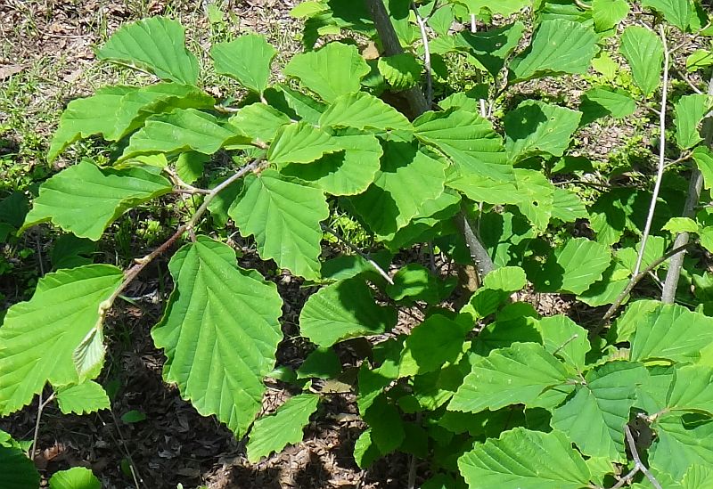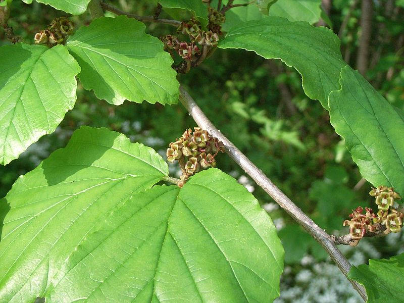 マルバマンサク:葉は卵形〜扇形で、葉裏は葉脈基部以外は無毛、2月から咲く。