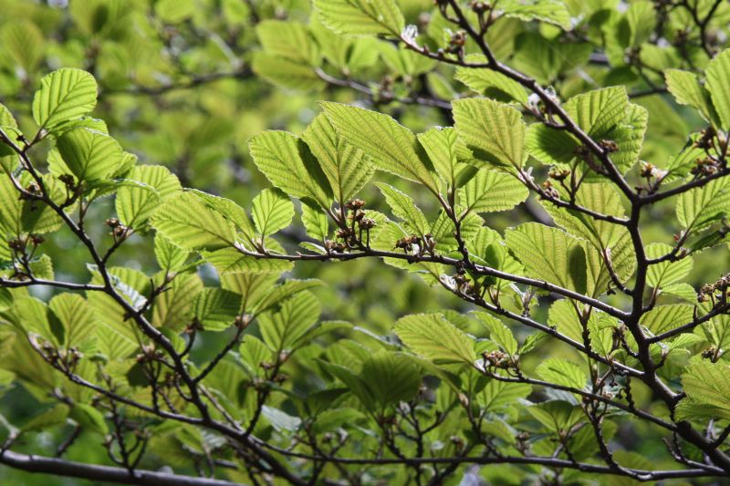 マンサク :葉は菱状円形で、葉裏に星状毛が散生、2月から咲く。