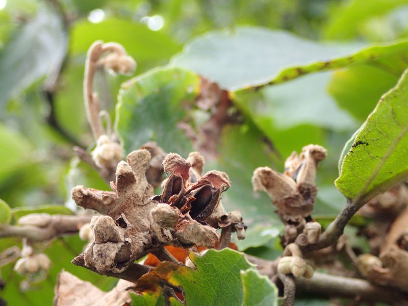 刮ハは褐色の短毛が密生し、熟すと2裂して黒褐色の種子が出る。(2015/10/8)