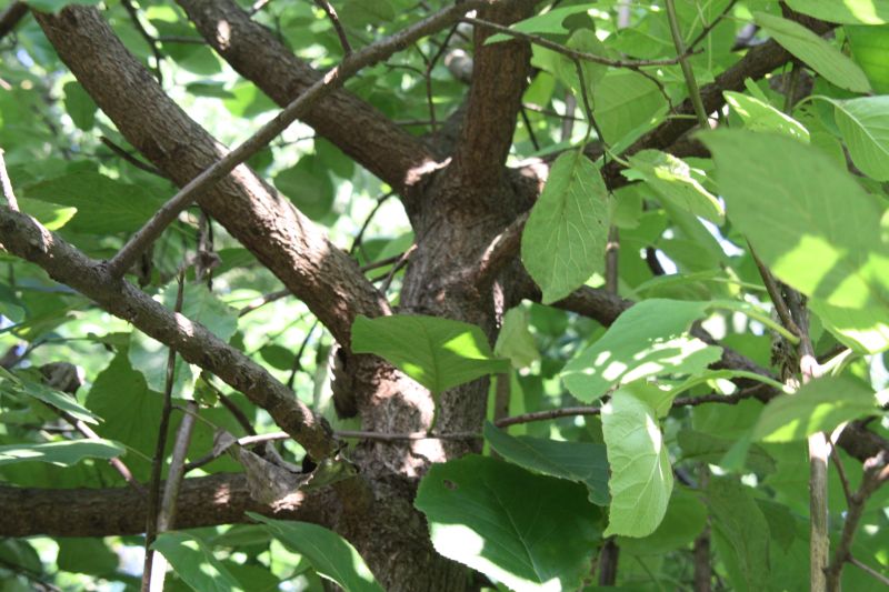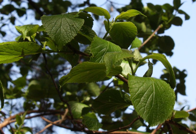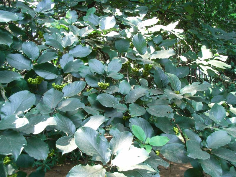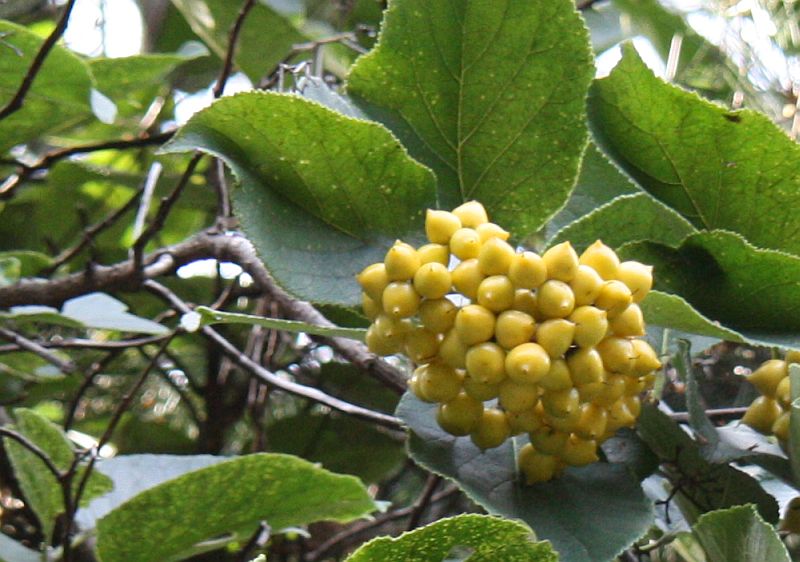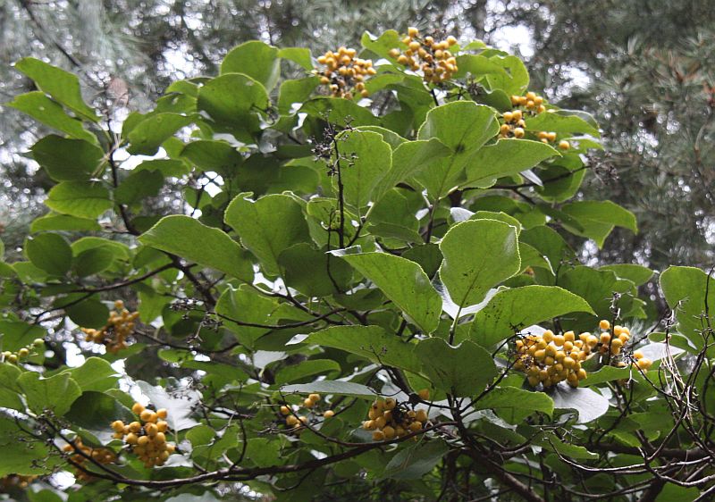 丸くて突起のある核果が房状につき、秋に黄色く熟す。