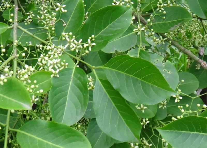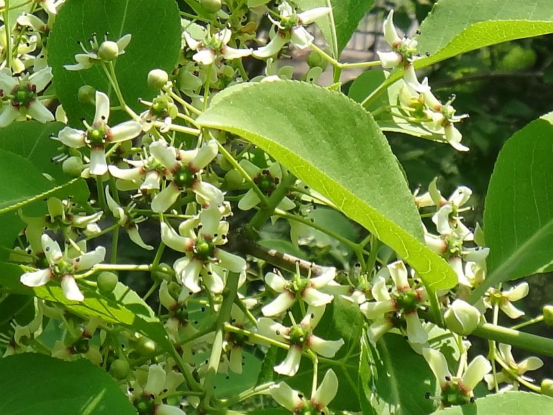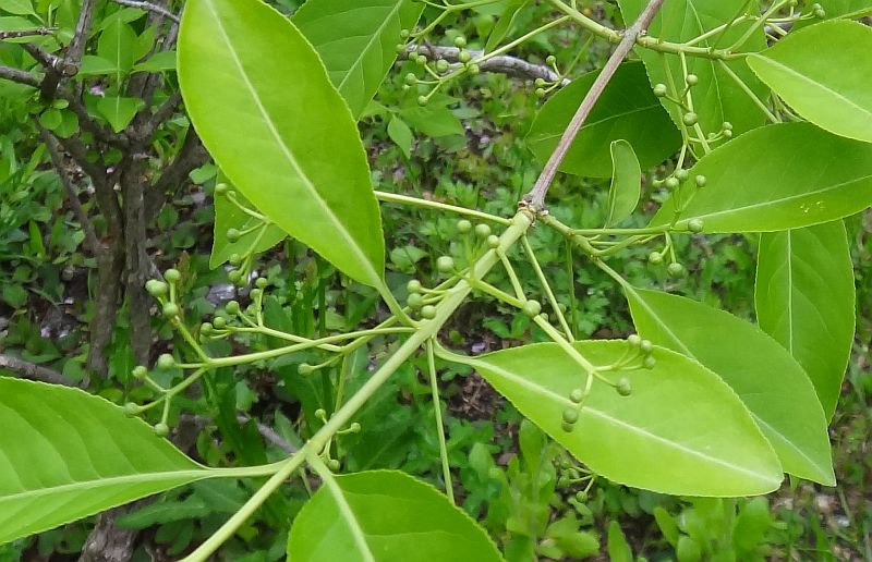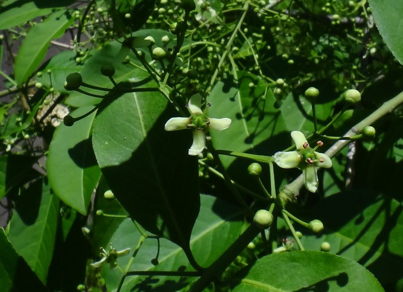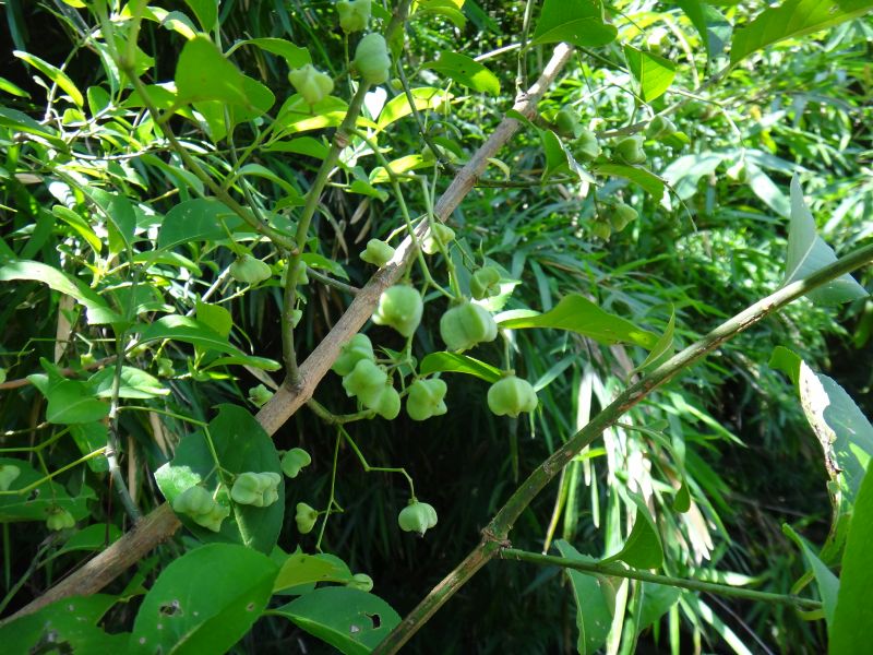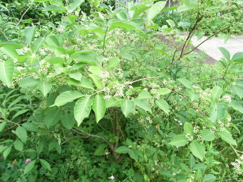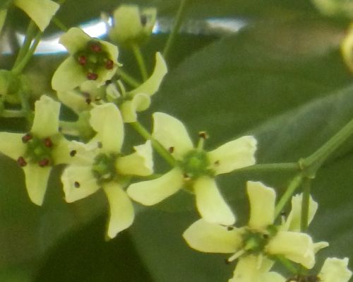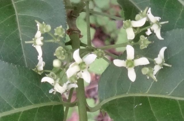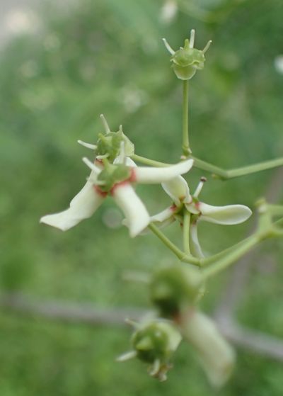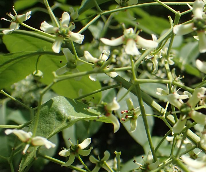 小さい緑白色の花をまばらにつける。