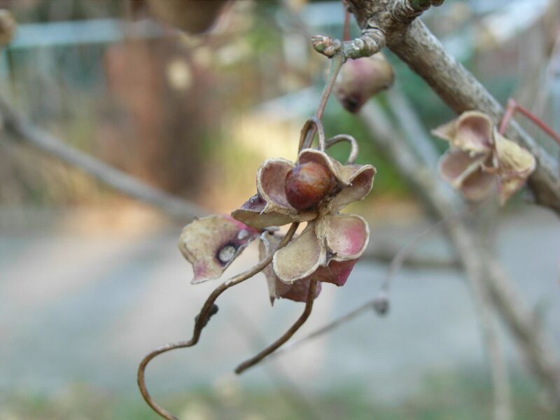 対角線で4つに裂け、赤い種子がでてくる。