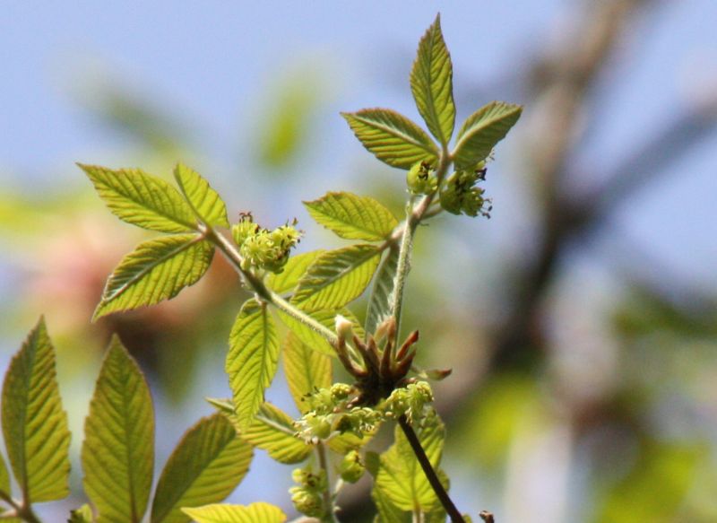 葉の展開とほぼ同時に側芽から出る散形花序に淡黄色の花をつける。