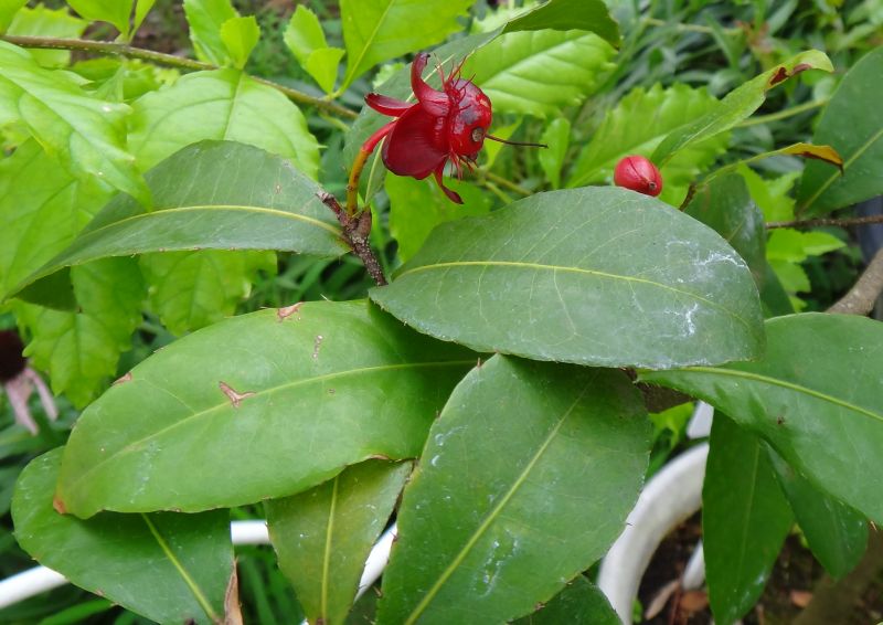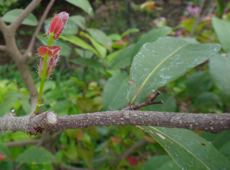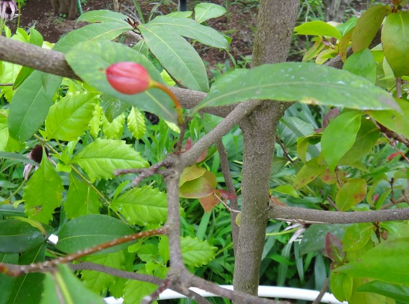 蕾は赤い。樹皮は灰褐色で、ザラザラしている。(2015/7/2)