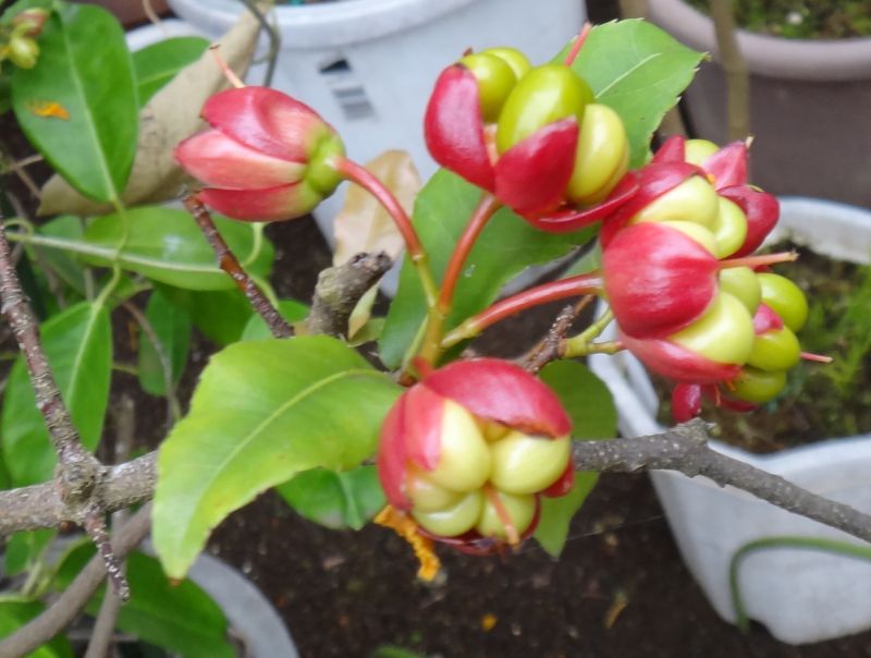 赤い花床に黒い核果が数個つく。(2016/3/16)