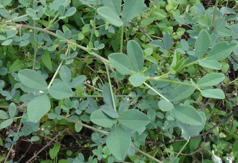 マルバハギ :小葉は丸くて先がへこみ、花序は葉より短く、枝があまり垂れない。