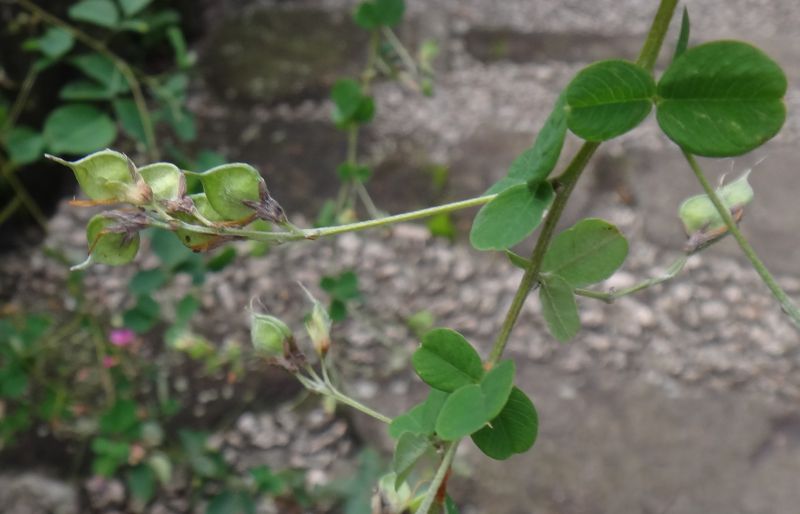 3出複葉が互生し、葉腋から出る花序に赤紫色の蝶形花がつく。