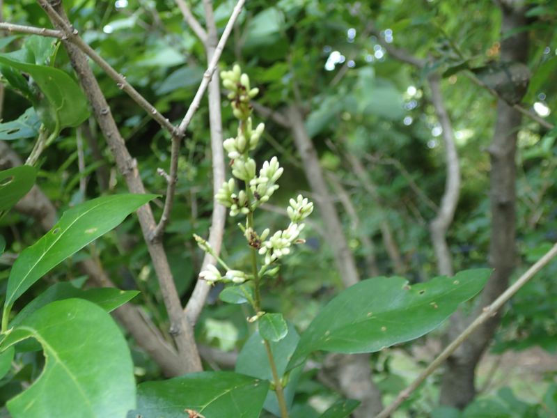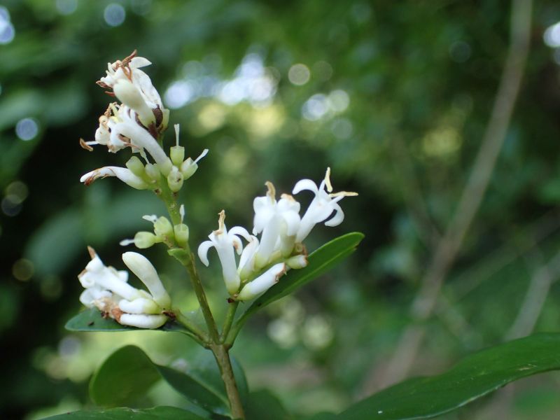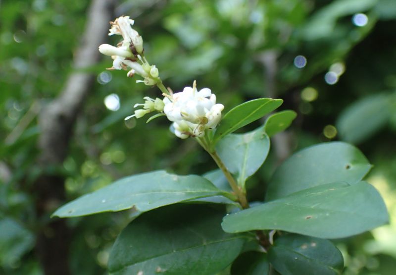 葉は全縁の楕円形で先が短く尖り、花は白い。