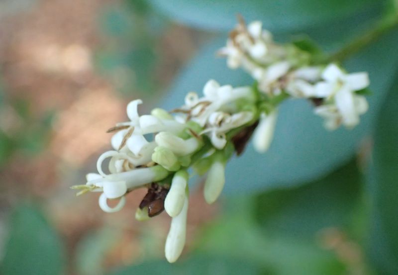 長さ6〜7ミリの白い漏斗状の花がかたまって咲き、