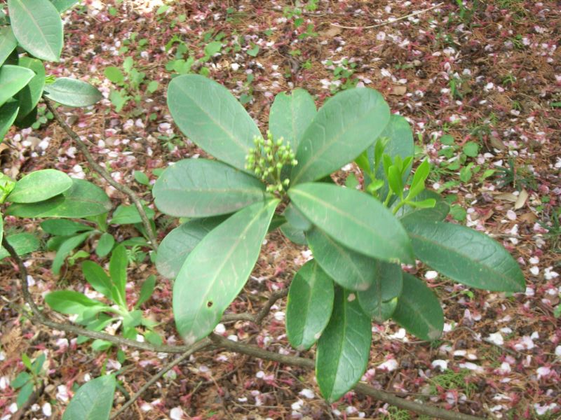 ウチダシミヤマシキミは、葉脈がへこんで葉が二つ折りになりかかっている。(2017/10/26)