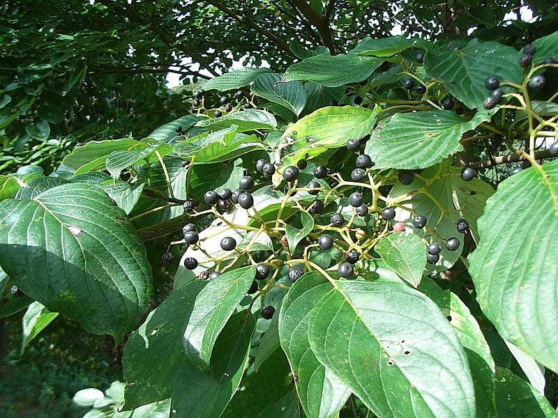 クマノミズキ:葉は卵状長楕円形で対生し、6月に開花し、核果が黒紫色に熟す。